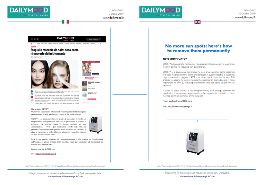 Home/ Press review/ No more sunspots: here’s how.../ No more sunspots: here’s how to remove them permanently Source: Daily Mood Publication 10 October 2019 Download PDF Press cutout for the exclusive use of Novavision Group SpA, not reproducible.